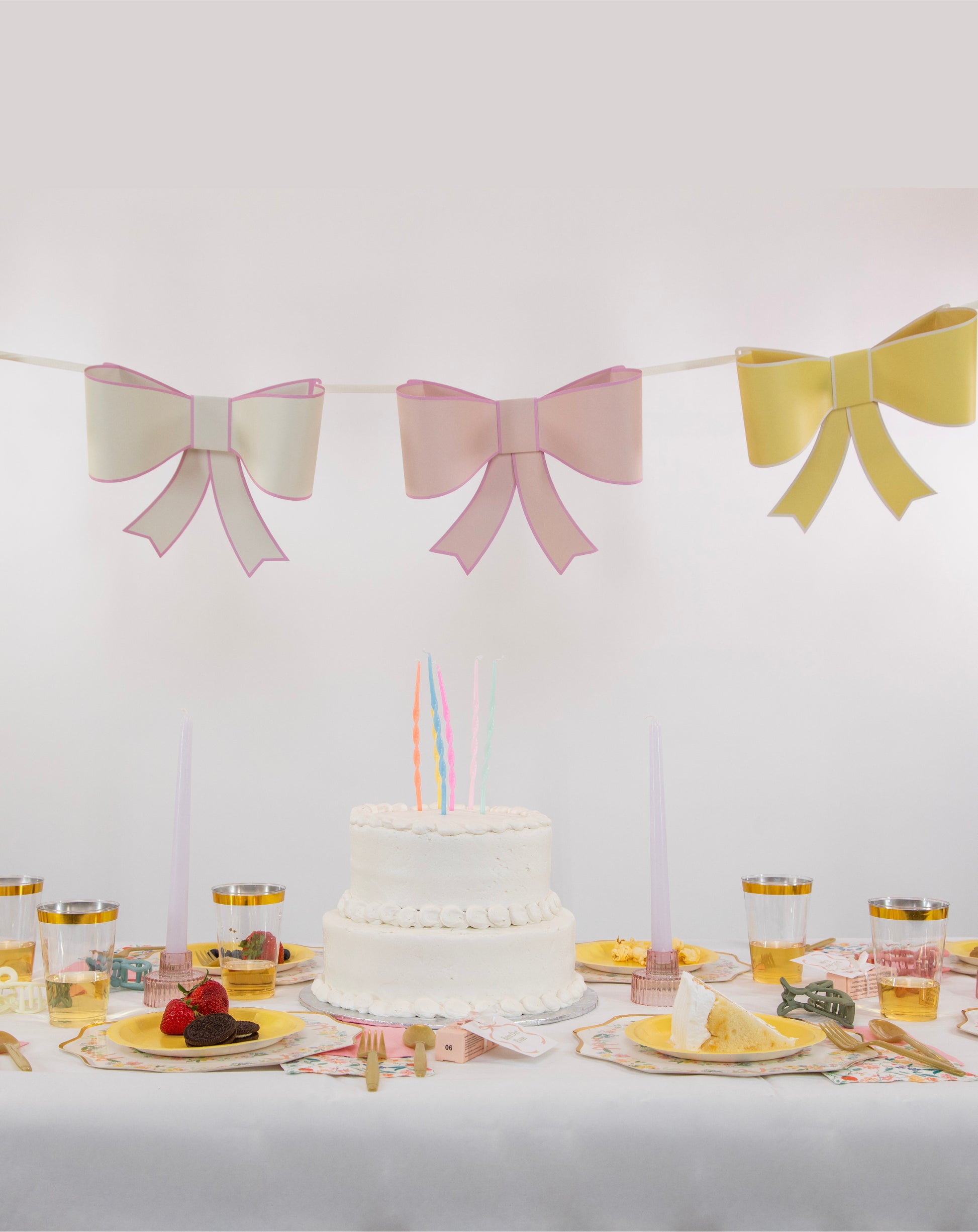 It features 16 floral dinner plates and yellow dessert plates, gold utensils, and layered napkins in pink and petite floral prints. Gold-rimmed cups bring the sparkle, while our signature paper bow garland and floral dessert toppers tie the theme together beautifully.