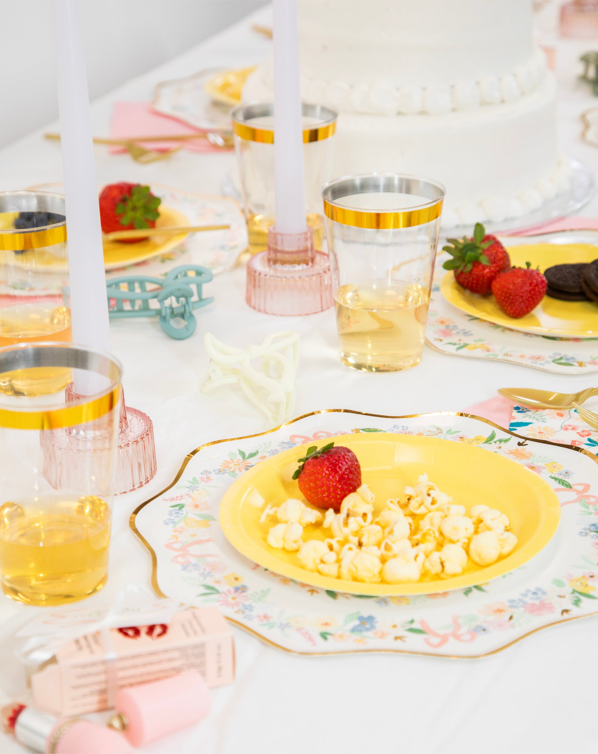 The icing on the cake? Gorgeous white candlesticks with pink glass holders, bow hair clips for each guest, and floral jelly lipstick favors (with tags!) that double as décor and take-homes. All you have to do is set the table and snap the pics.