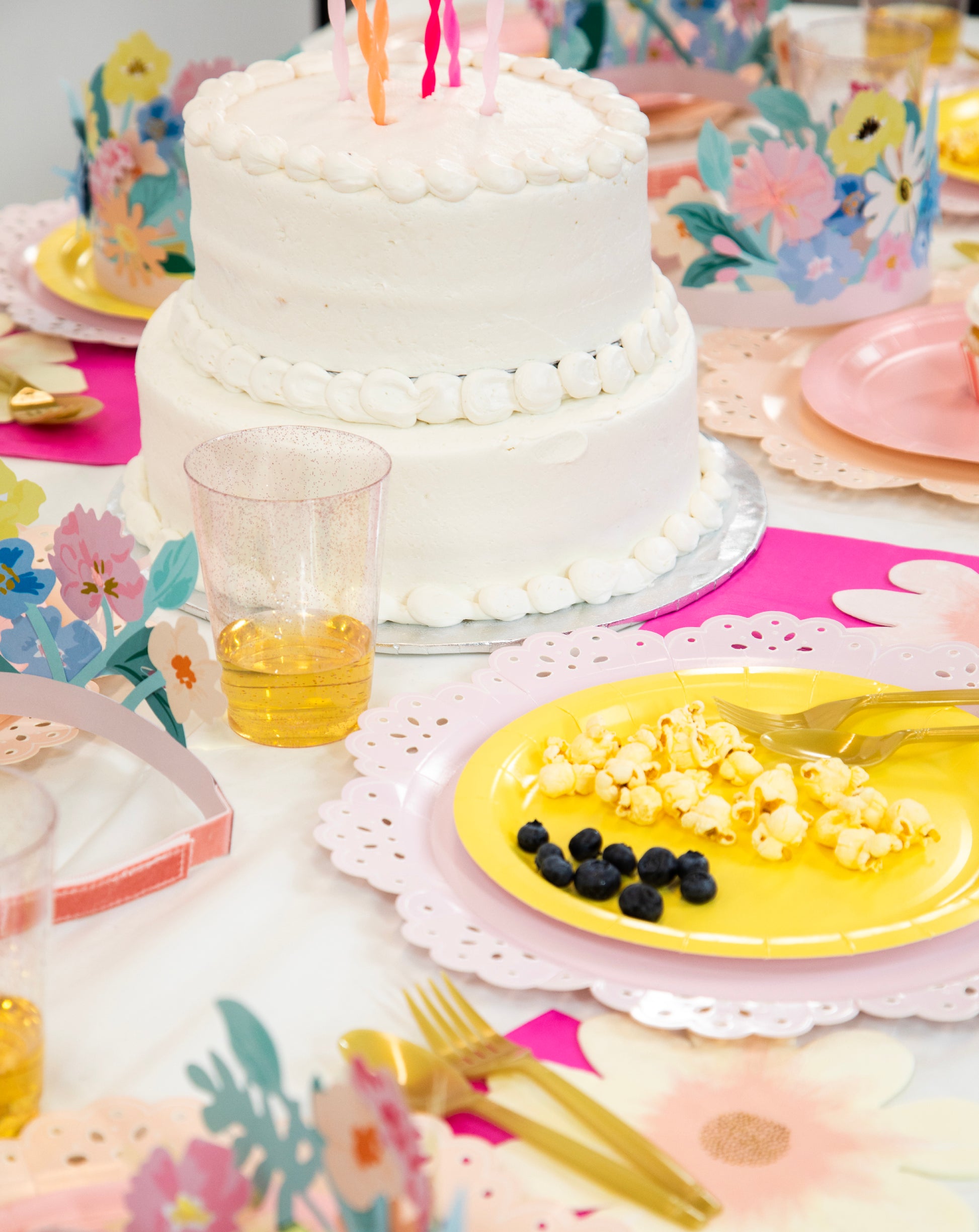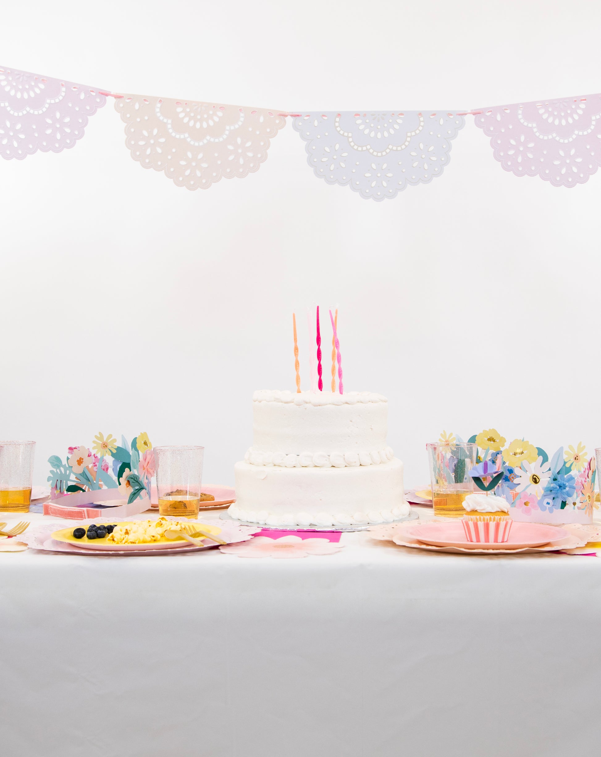 Enjoy multi-color lace-edged dinner and dessert plates, gold utensils, and pink glitter cups. Adorable flower garden napkins and bright pink lunch napkins add a playful pop of color, while floral dessert toppers and pink twisted candles dress up your sweet treats. Complete the dreamy vibe with a lace pennant garland and 1 paper flower headdress for each guest.