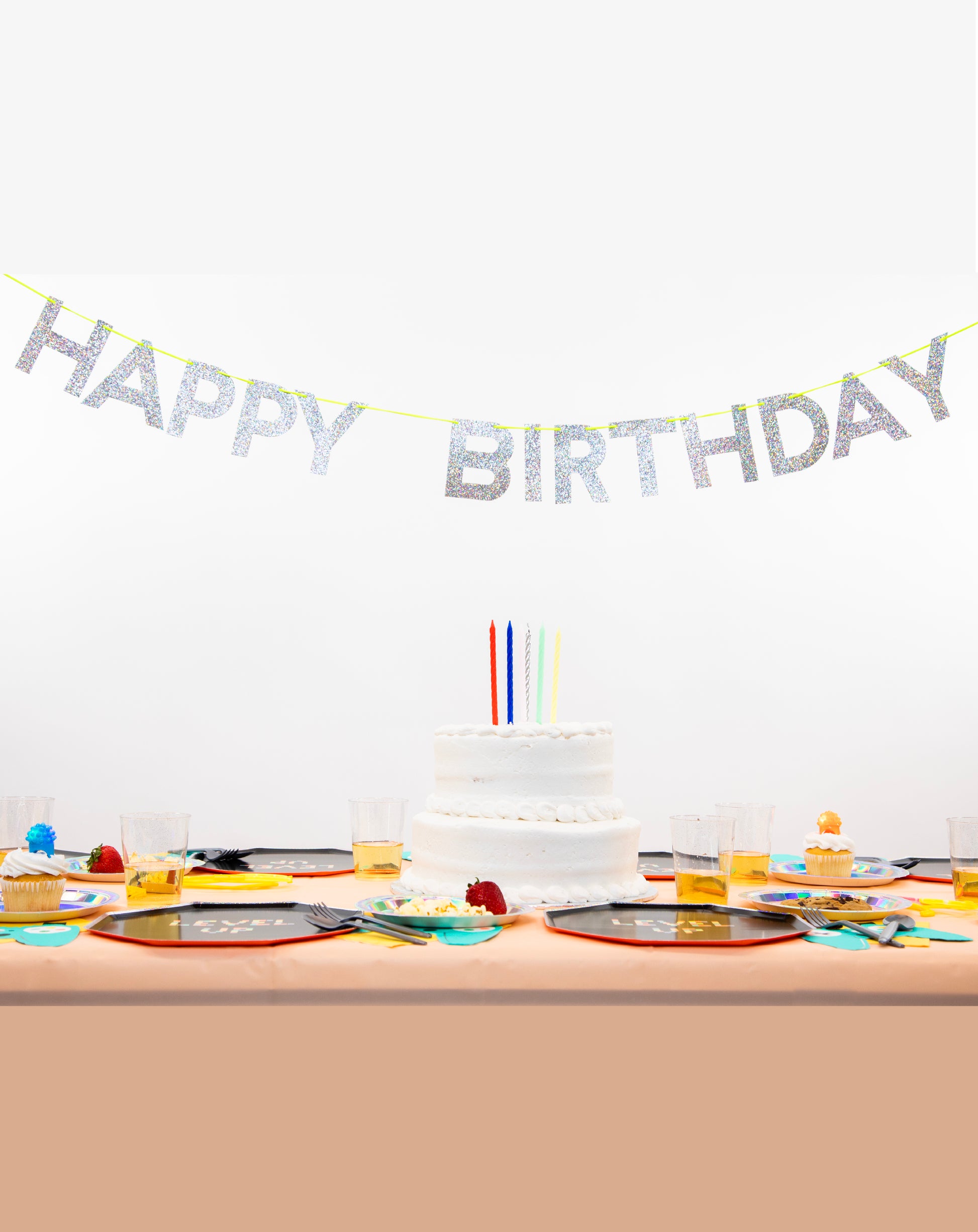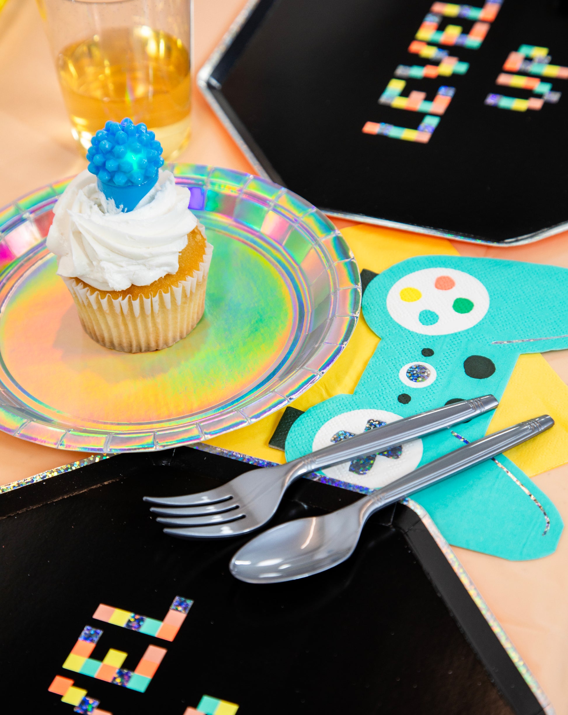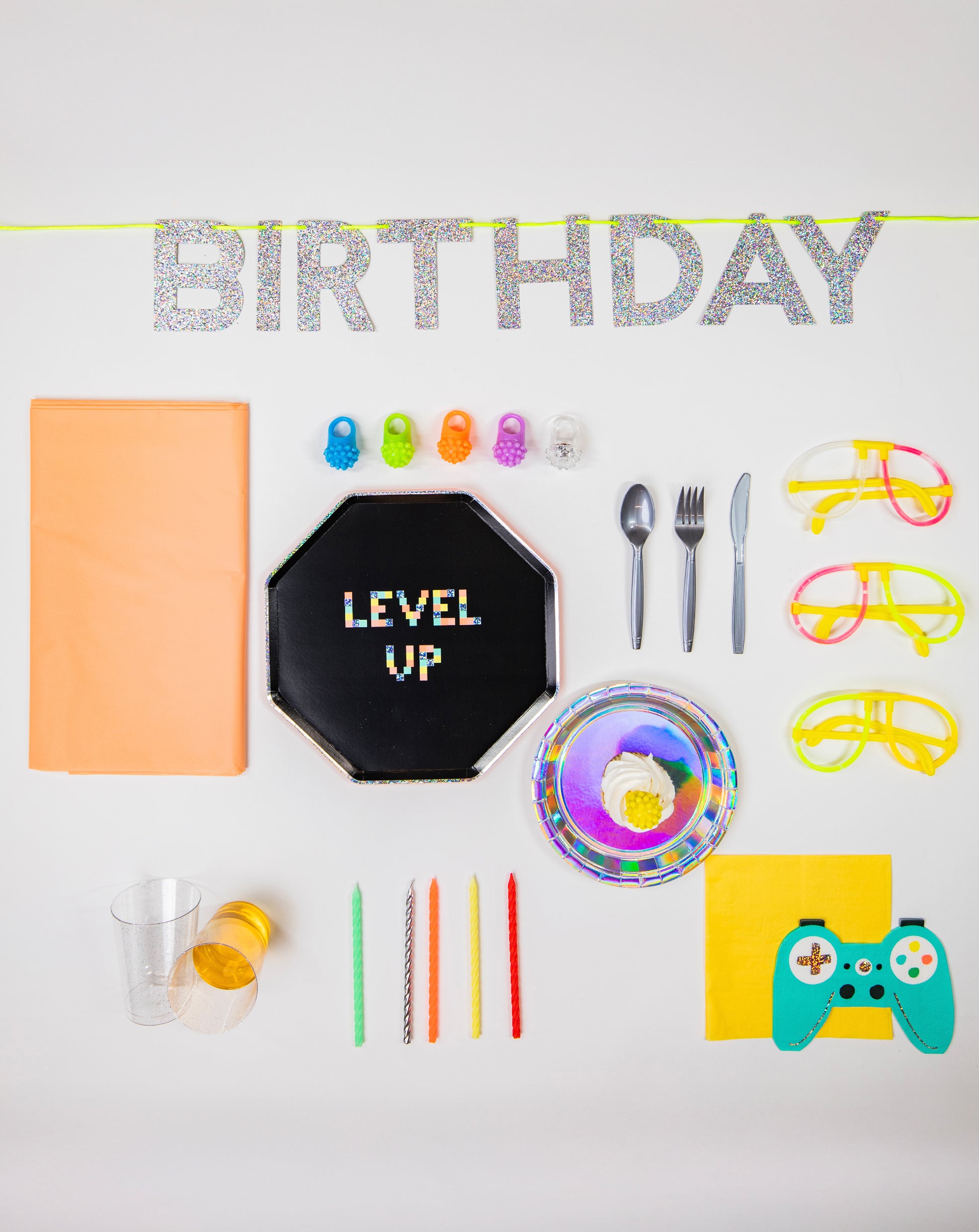 Includes vibrant dinner plates with “Level Up” designs, iridescent dessert plates, silver utensils, and sparkling glitter cups. Game controller napkins, yellow lunch napkins, and a peach tablecloth set the scene, while neon glow ring dessert toppers and twisted candles level up your treats. Top it off with a silver “Happy Birthday” garland and fun glow glasses for all the players.